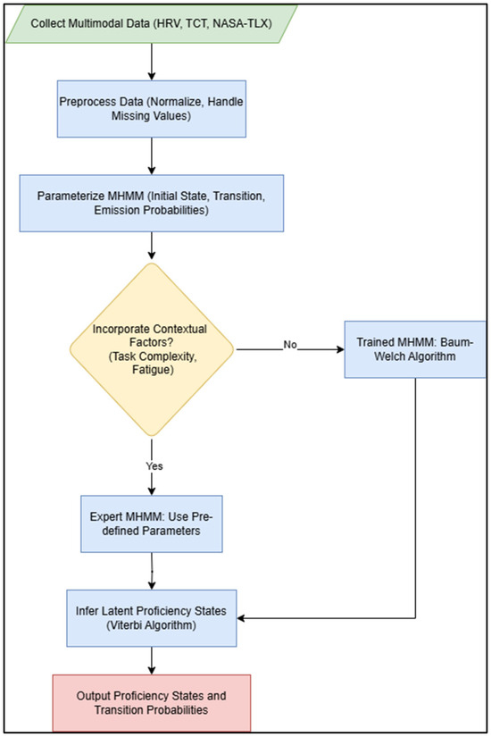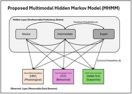 To overcome the limitations of static and unimodal assessments, this research proposes a Multimodal Hidden Markov Model (MHMM). The MHMM is parameterized using published empirical data from surgical training studies (Shrivastava et al., 2025) [], ensuring its parameters reflect real-world physiological, behavioral, and subjective metrics. It dynamically infers latent proficiency states (Novice, Intermediate, and Expert) using three complementary observation streams: