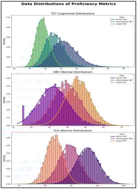 - Probabilistic Linking: The HMM probabilistically connects these hidden proficiency states to observable data, such as physiological metrics (e.g., HRV), behavioral metrics (e.g., TCT), and subjective feedback (e.g., responses on the NASA-TLX). This linkage allows a comprehensive understanding of proficiency that is informed by real-world indicators [].
