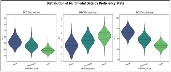 The combination of HRV, TCT, and NASA-TLX creates a balanced framework for assessing proficiency. HRV provides physiological insights into an operator’s internal state, TCT offers a measure of task performance that is likely to link to higher-level productivity metrics, and NASA-TLX captures subjective perceptions of workload. This triad enables a comprehensive understanding of human proficiency, ensuring that critical aspects of performance are not overlooked, which is often the case in unimodal assessments [,,].