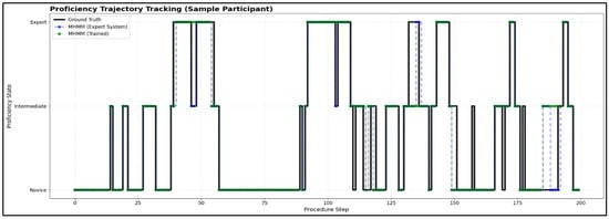- Superior Temporal Modeling: Unlike static classifiers, such as Artificial Neural Networks (ANNs) and k-Nearest Neighbors (KNN), which consider each data point independently, the MHMM is built to model sequences of proficiency states through its transition matrix. This allows it to track the evolution of proficiency, capturing learning curves and fatigue onset. Research on vigilance and driving fatigue underscores the importance of such capabilities for accurate assessments of human performance, showing that dynamic modeling is key in tracking changes in performance over time rather than relying on static assessments [].