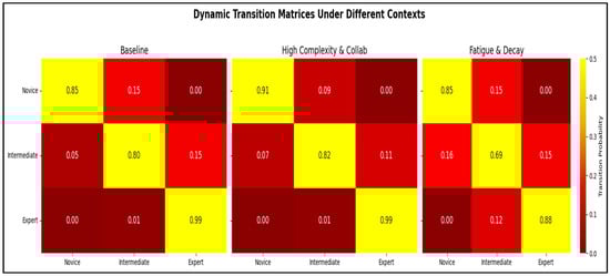 The MHMM leverages this integration and models temporal dynamics through a probabilistic framework, capturing transitions such as learning progression, fatigue onset, or proficiency decay. Grounded in classic learning theories (Dreyfus’s five-stage model and Fitts & Posner’s three-phase framework) the MHMM is parameterized with empirical benchmarks drawn from surgical simulation studies and smart-factory task-analysis datasets [,,,,]. In contrast to black-box architectures such as deep neural networks, the MHMM provides interpretable transition matrices and state-specific emission probabilities, enabling real-time insights into operator development and risk.