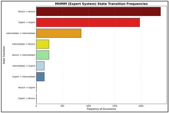 Markov chains provide a foundational framework for these temporal models. A Markov Chain is a statistical model in which the probability of transitioning to the next state relies solely on the current state, allowing the assessment of transitions between proficiency states, such as from Novice to Intermediate. This transition probability can yield insights into learning rates and the stability of proficiency levels [,]. However, traditional Markov Chain models assume that these states are directly observable, while true proficiency is inherently latent and inferred from observable behavior rather than measured directly [].
