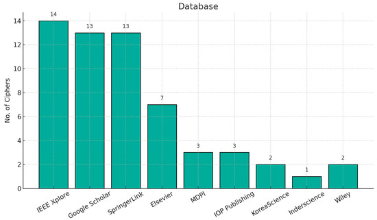Literature resources in this article were collected from multiple digital databases commonly used by cryptography researchers. These include IEEE Xplore (IEEE), SpringerLink (Springer), ScienceDirect (Elsevier), Google Scholar, MDPI, IOP Publishing, KoreaScience, Wiley Online Library, and Inderscience, as shown in Figure 2. Each of these platforms hosts peer-reviewed journals or conference proceedings relevant to lightweight cryptographic design, ensuring that all surveyed ciphers are derived from academically credible and accessible sources.