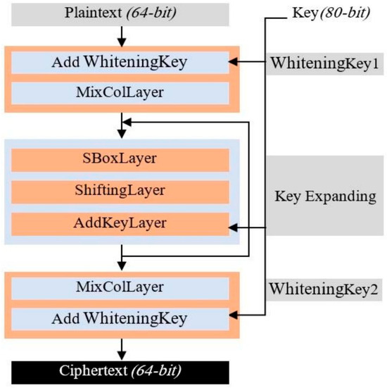 - Hatzivasilis, G.; Fysarakis, K.; Papaefstathiou, I.; Manifavas, C. A review of lightweight block ciphers. J. Cryptogr. Eng. 2018, 8, 141–184. [Google Scholar] [CrossRef]