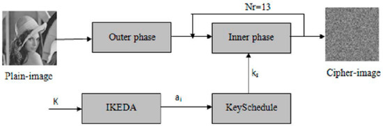 RARE [12] (Robust Algorithm for Rapid Encryption) is a lightweight cryptosystem designed specifically for image encryption in IoTs applications. The cipher targets the challenges presented by image data, such as high redundancy, correlation, and voluminosity, which can undermine the security of traditional lightweight ciphers. RARE uses an innovative “Outer-Inner” structure, as shown in Figure 5, where the outer phase applies horizontal and vertical diffusion to reduce image redundancy and correlation, while the inner phase divides the image into sub-blocks and processes them using a block cipher in ECB mode. The system ensures high diffusion and confusion properties, essential for secure image encryption. RARE outperforms existing lightweight ciphers in terms of correlation reduction, entropy increase, and enhanced diffusion. It also shows improved resistance to differential and linear cryptanalysis, demonstrating a lower number of rounds required for secure encryption. Furthermore, RARE is faster and more efficient compared to other ciphers such as PRESENT and RoadRunner, making it highly suitable for IoTs applications that require both security and real-time processing.