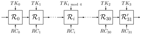 - Sakamoto, K.; Minematsu, K.; Shibata, N.; Shigeri, M.; Kubo, H.; Funabiki, Y.; Bogdanov, A.; Morioka, S.; Isobe, T. Tweakable TWINE: Building a Tweakable Block Cipher on Generalized Feistel Structure. In Advances in Information and Computer Security, Proceedings of the 14th International Workshop on Security, IWSEC 2019, Tokyo, Japan, 28–30 August 2019; Springer: Cham, Switzerland, 2019; pp. 129–145. [Google Scholar] [CrossRef]