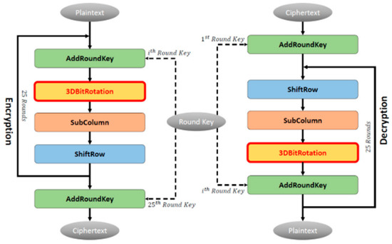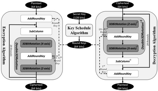 LAO-3D [23], or the 3D light algorithm operation, is a lightweight symmetric block cipher designed to enhance the security and efficiency of mobile encryption applications. It employs a 3D permutation structure, incorporating a 3D bit rotation function to strengthen the cipher’s confusion and diffusion properties without increasing block or key sizes, thus maintaining computational efficiency. The cipher operates on a 64-bit block size with a 128-bit key and features 20 rounds, as illustrated in Figure 16. The encryption process includes key addition, non-linear S-box substitution, and a double 3D bit rotation for enhanced permutation. Security analysis demonstrates LAO-3D’s resistance to differential and linear cryptanalysis, achieving high non-linearity, a 50% bit error rate, and excellent randomness. Performance tests indicate that it has a competitive encryption speed and throughput compared to existing ciphers, making it ideal for mobile and IoTs applications requiring both strong security and efficiency. Additionally, the cipher was successfully implemented in a mobile encryption application, further proving its practical applicability.