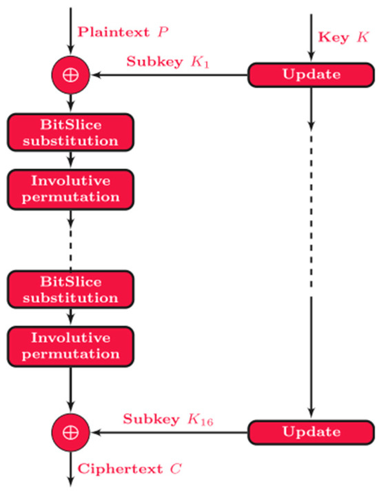 The Ultra-Lightweight Method (ULM) [22] is a cryptographic design approach proposed specifically for IoTs environments that require minimal memory usage, high efficiency, and strong security. ULM combines three lightweight cryptographic techniques, as represented in Figure 15—Bitslice, Wide Trail Strategy (WTS), and involutive operations—to create a design framework that optimizes diffusion, confusion, and execution speed. It uses a 64-bit block size, an 80-bit key, and operates over 15 SPN-based rounds, each including subkey mixing, substitution using a 4 × 4 S-box, and an involutive bit permutation. This structure enables the implementation of block ciphers with low RAM and ROM consumption, fast processing time, and robust resistance to linear and differential attacks. A reference cryptosystem built using ULM demonstrates superior performance compared to existing lightweight methods, making ULM an effective foundation for secure encryption in constrained IoTs devices.