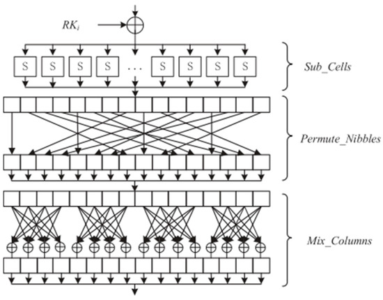 FUTURE [24] is an LWBC tailored for resource-constrained IoTs devices, utilizing a substitution-permutation network (SPN) structure with 32 rounds. It supports a 64-bit block size and offers key lengths of 64, 96, or 128 bits, making it flexible for varying security requirements. Each encryption round of the FUTURE cipher comprises four sequential transformations: SubCells (SCs), MixColumns (MCs), ShiftRows (SRs), and AddRoundKey (ARK) (see illustration in Figure 17), which together enhance diffusion and strengthen resistance against linear and differential attacks. The cipher is designed to achieve low memory usage, energy efficiency, and high execution speed, making it well-suited for embedded systems. Its structure and operations are kept simple to reduce computational complexity and facilitate implementation on low-power hardware, providing an effective balance between performance and basic security.