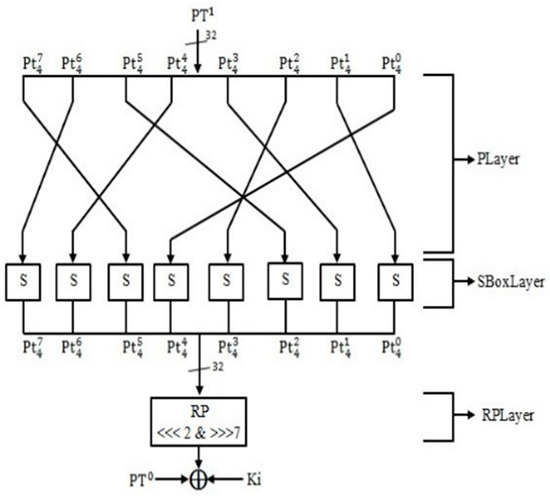 The SAT_Jo [13] block cipher is designed for secure data encryption in IoTs environments, particularly for tag-based applications with resource-constrained devices. Built on a substitution-permutation network (SPN) structure, SAT_Jo employs a 64-bit block size and 80-bit key, performing 31 rounds of encryption as illustrated in Figure 6. It features a 4 × 4 S-box derived from the Galois Field (GF(24)), providing non-linear transformations to strengthen security. A permutation layer, characterized by bijective mappings, ensures additional diffusion. The cipher uses a novel key scheduling technique based on Fibonacci sequences and includes a post-whitening step to enhance the final output. SAT_Jo is specifically optimized to balance security and efficiency, offering adequate protection against common cryptographic attacks while maintaining low resource usage, making it ideal for IoTs applications where computational power and memory are limited.