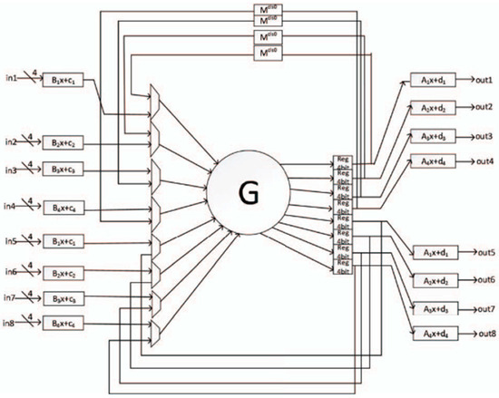 HERMES [16] is an LWBC designed to secure resource-constrained devices such as IoTs devices, microcontrollers, and RFID chips. It operates with 64-bit plaintext blocks and 128-bit keys, making it suitable for environments where memory, processing power, and energy are limited. Hermes features a simple yet effective structure using an 8 × 8 matrix of transformations, including bitwise operations and an S-box for non-linearity as depicted in Figure 9. With 30 rounds of encryption, it strikes a balance between strong security and minimal resource requirements. The cipher is optimized for low-power consumption, small code size, and efficient memory use. Security analyses show that Hermes is resistant to common cryptographic attacks, including differential, linear, and other advanced attacks, while also providing high diffusion and confusion properties. Hermes’ efficiency in both hardware and software implementations makes it an ideal candidate for deployment in IoTs and similar applications where traditional cryptographic methods may be too resource-intensive.