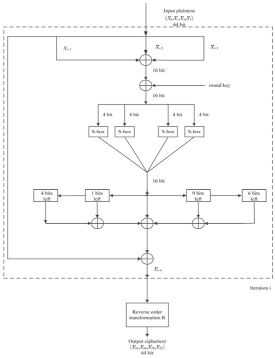 The NVLC [11] (New Variant Lightweight Cryptographic Algorithm) is a symmetric block cipher specifically designed for IoTs applications with constrained resources. It operates on 64-bit blocks with key sizes of either 80 bits or 128 bits. The cipher utilizes six rounds for basic security, although twenty rounds are implemented to increase encryption complexity. The NVLC algorithm incorporates a substitution-permutation network (SPN) structure, combining mathematical and logical operations for efficiency in IoTs environments. The algorithm’s key features include whitening, a mix-column layer, a 4-bit S-box, a key schedule derived from the PRESENT algorithm, and a shifting layer for diffusion as presented in Figure 4. Security evaluations show that NVLC is resilient against various cryptographic attacks, including differential and linear attacks, while achieving a low hardware cost of just 1134 gate equivalents (GEs). This makes it a highly efficient choice for low-cost IoTs applications such as RFID tags and sensors, ensuring both security and performance with minimal resource consumption.