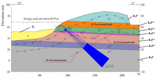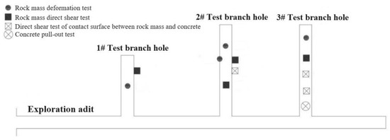 Due to the consideration of the field scaling test design, it is necessary to conduct on-site rock mechanics property tests. Representative strata will be selected in the inclined tunnel for rock deformation tests (4 groups), rock direct shear tests (4 groups), direct shear tests on the contact surface between concrete and rock mass (3 groups), and tensile strength tests on the cohesion between concrete and rock mass (1 group). The location and experimental layout of the inclined tunnel are detailed in Figure 1 and Figure 2.