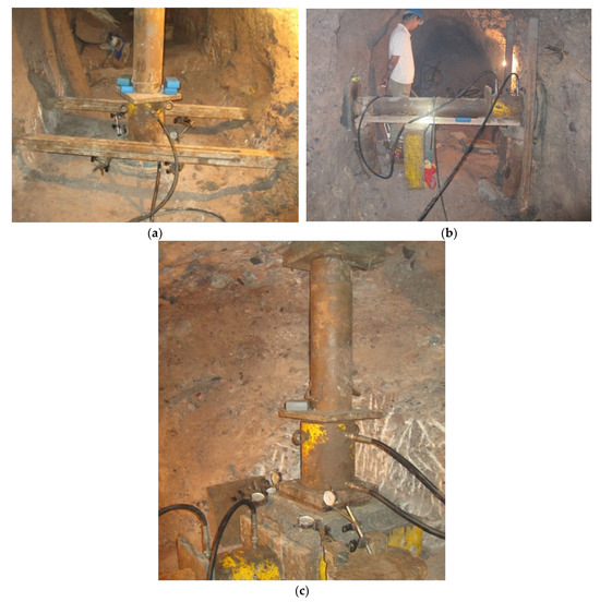 On-site rock mechanics test. (a) Vertical loading of rock deformation test; (b) horizontal loading of rock deformation test; (c) rock mass direct shear test.