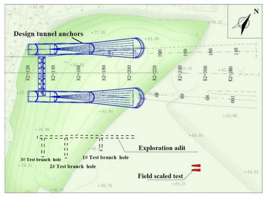 The scaled model test was conducted by comparing the terrain, physical and mechanical properties of the rock mass, and other conditions. It was selected at a relatively open and spacious platform in the northern part of the hill where the tunnel anchor is located. The test plan was arranged according to the actual double anchoring mode of the tunnel anchor. The test location is shown in Figure 4.
