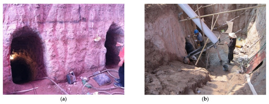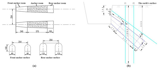 Some scholars have analyzed the deformation characteristics and failure modes of tunnel anchor-surrounding rock systems by in situ scaling model tests. Wu et al. revealed the mechanical rock mass characteristics of tunnel anchors under different load conditions through large-scale field model tests and evaluated the potential load-bearing performance of tunnel anchors in the proposed super-large railway suspension bridge based on practical application cases [19]. Based on field model tests, Han et al. analyzed the load-bearing performance of tunnel anchors in soft rock with weak interlayers, and divided the deformation stages of the surrounding rock, and determined that the final failure mode of tunnel anchors under special geological conditions was similar to that of inverted wedges [3,20].