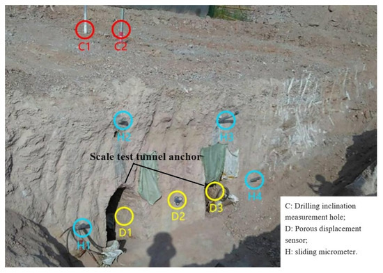 Nine monitoring holes are set up in the anchorage and surrounding rock during the experiment, and the detailed locations of each monitoring hole are shown in Figure 8 and Figure 9. The inclinometer hole employs a high-precision digital inclinometer (Shaanxi Right M&C Technology Co., Ltd., Xi’an, China) with an accuracy of ±0.02 mm/m, the sliding micrometer utilizes an SMP-100 model sliding micrometer with ±0.003 mm precision, and the multi-point borehole extensometers adopt vibrating wire-type displacement sensors (Durham Geo Slope Indicator, Seattle, WA, USA) with ±0.1% FS accuracy.