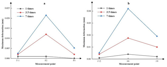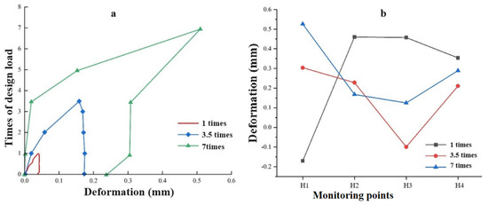 According to the multi-point displacement meter test results of D2, the deformation of its free face significantly increases with the increase in load, as shown in Figure 11a. Under the design load, the maximum deformation of the free face is 0.046 mm. Under 3.5 times the design load, the maximum deformation of the free face is 0.158 mm. Under 7 times the design load, the maximum deformation of the free face is 0.509 mm. With the increase in load, the deformation of the free face increased by 3.4 times and 11.1 times, respectively, and the larger the load, the greater the growth rate of deformation.