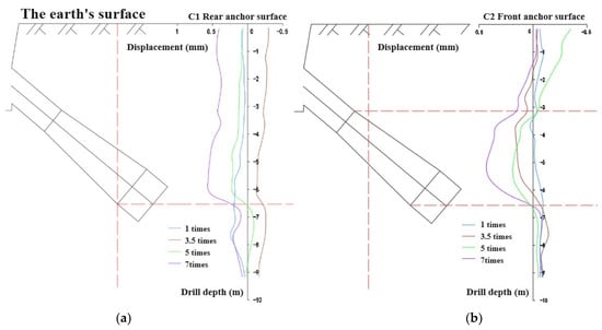 Under step-by-step loading, the deformation of the rock mass between anchors can be continuously monitored, and analyzing the failure mode of the anchor based on its deformation is more accurate. The boundary point of deformation is located at a depth of 6.2 m on the front anchor face, and the rock mass with a depth of more than 6.2 m shows a relatively uniform horizontal deformation, which is more obvious at 5 times the design load, as shown in Figure 17a. The boundary point of deformation is at a depth of 6.5 m on the rear anchor surface. The rock mass at a depth of 3.5–6.5 m shows obvious horizontal displacement, which is very obvious at 7 times the design load. Above a depth of 3.5, it shows deformation on the rear anchor surface and shows a certain inclination, as shown in Figure 17b.
