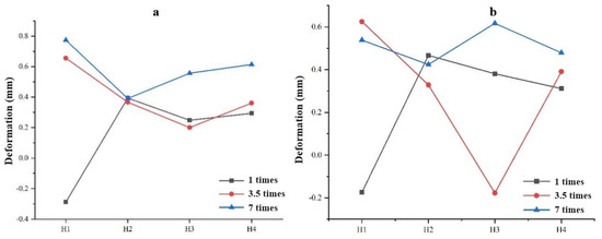 Deformation trend chart of measuring holes. (a) Front anchor surface; (b) rear anchor surface.