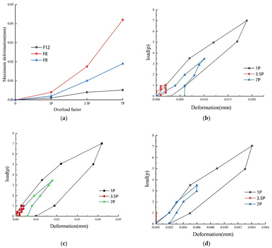 Dislocation meter deformation curve. (a) Deformation curve under different loads; (b) dislocation meter F9 deformation curve; (c) dislocation meter F8 deformation curve; (d) dislocation meter F1 deformation curve.