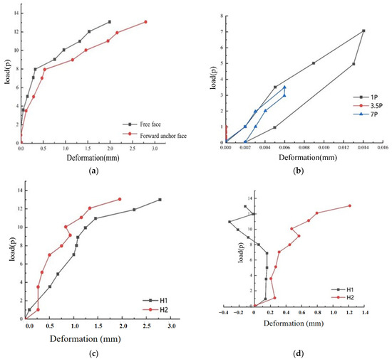 According to the analysis of the deformation monitoring results of the sliding micrometer at the free face, front anchor face, and rear anchor face from H1 to H4, as the load level increases, the deformation at the free face and front anchor face will gradually increase. The deformation trend of the axis of the rear anchor surface is relatively disorderly. Overall, the deformation of the lateral rock mass is slightly greater than that of the upper rock mass of the anchor plug, as shown in Figure 11b and Figure 13.