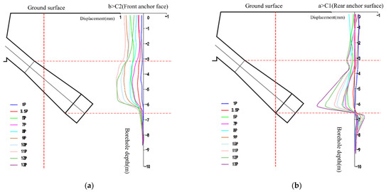 Cumulative deformation curves inside the hole. (a) C1Rear anchor surface; (b) C2 Front anchor surface.