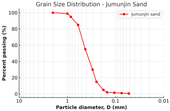 Sand is used as a backfilling material on top of underground facilities to facilitate construction as well as to protect the facilities [20,21]. Therefore, in this study, Korean standard sand was used to minimize the impact of property differences caused by ground characteristics and to maintain constant conditions. A laboratory model test was conducted to examine the effects of the relative density, groundwater level, and fines content during the fabrication of the soil box on cavity formation. Figure 1 shows the particle size distribution of the standard sand; Table 1 lists its basic properties. The particle size distribution and physical properties of the samples used in this study were determined in accordance with ASTM D6913, D7928, D854, D4254, D4253, D698, D2487, and D4318.
