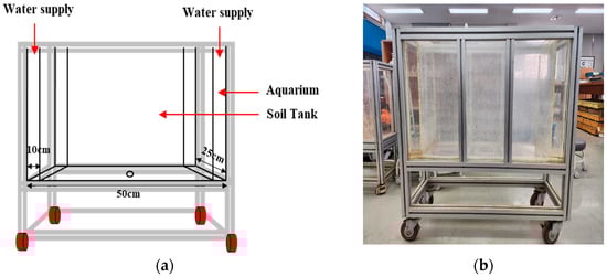(a) Schematic diagram of the model soil box and (b) image of the experimental setup including the soil box.
