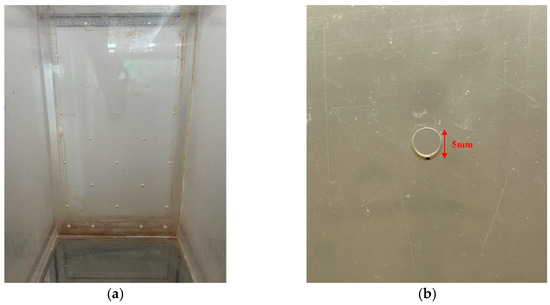 Details of the water flow system between the water tank and the soil box: (a) general view of the interface showing multiple 5 mm diameter holes, (b) close-up view of a circular hole (5 mm in diameter) for water inflow.