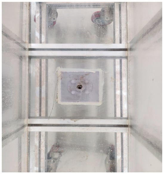 An experimental setup was fabricated to simulate the ground of a damaged sewer pipe. Figure 2 shows the configuration. The experimental setup was fabricated using transparent acrylic panels to observe underground cavities, and it was reinforced with a metal frame to prevent the deformation of the soil box. The soil box used to simulate the ground measured 50 cm in width, 25 cm in depth, and 50 cm in height, and a permeable water tank 10 cm in width, 25 cm in depth, and 50 cm in height was attached to both sides of the soil box to simulate the groundwater level. As shown in Figure 3, circular holes 5 mm in diameter were created between the water tanks and the soil box so that water could flow from the water tanks to the soil box. Filters were installed on the sides of the soil box to prevent soil discharge between the soil box and the water tanks when the groundwater level rose. As shown in Figure 4, a crack was created on the bottom surface of the soil box to simulate a crack in a sewer pipe. The shape and size are significant factors affecting the experimental results, but this study assumed the circle crack with a diameter of 1.5 cm. It was used to induce soil discharge by forming a seepage flow under fluctuations in the groundwater level. In addition, a drainage valve was installed on the crack to prevent the loss of soil particles until the model ground was fully saturated. However, in this study, geometric, kinematic, and dynamic similarity laws between the prototype (actual structure) and the laboratory model were not strictly applied, and no specific similarity ratio (e.g., 1:20, 1:50) was adopted. The size of the soil box was determined primarily based on laboratory installation feasibility and minimization of boundary effects, rather than on analytical similarity laws. Therefore, the significance of the experimental results in this study lies in the qualitative analysis of the mechanism and behavior of ground subsidence, rather than in quantitative prediction.