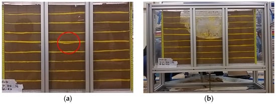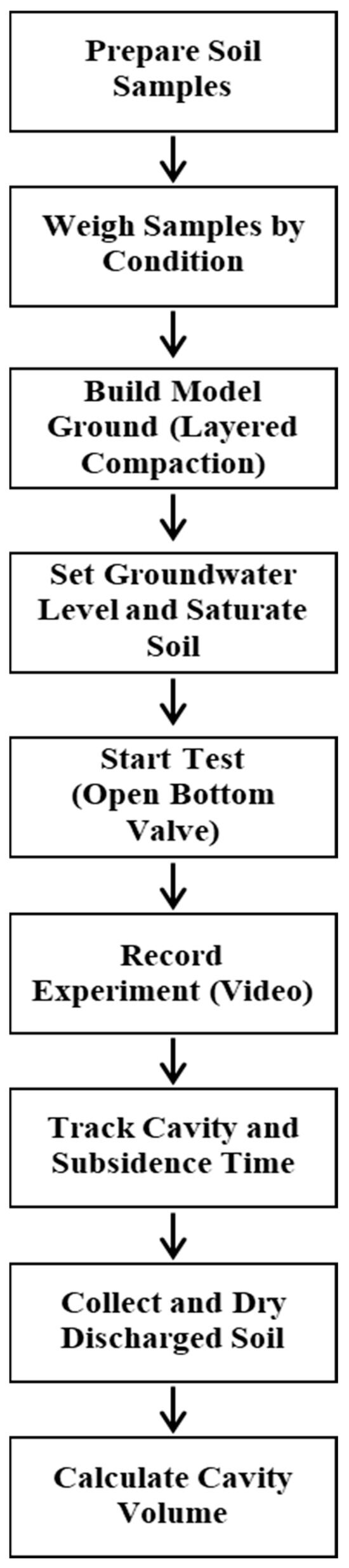 In the experiment, points at which cavities and ground subsidence occurred were determined to identify the ground subsidence mechanism. Since it was difficult to clearly observe cavity formation inside the soil box, the ground behavior on the walls of the soil box was observed. The ground subsidence process was divided into cavity formation and ground subsidence. Figure 5a shows the point at which cavity formation occurred in the model ground due to soil loss. It was defined as the moment when the movement of the colored sand occurred on the soil box observation surface (front). Figure 5b shows an image of the scene defined as ground subsidence. Ground subsidence was defined as the moment when the ground surface completely collapsed. In addition, the time until cavity formation and ground subsidence after the start of the experiment was measured using a stopwatch and video to analyze ground subsidence tendencies under experimental conditions. The dry weight of the soil discharged through the bottom of the soil box until cavity formation was measured to estimate the cavity volume under these conditions. Figure 6 shows a flowchart of the experimental process.