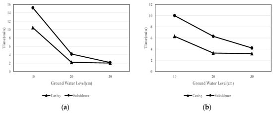 The ground subsidence mechanism was analyzed with respect to the groundwater level. Figure 7 shows the time until cavity formation and ground subsidence (stabilization) with respect to the groundwater level. Figure 7a shows the results for relative densities of 60% and 75% (Figure 7b), respectively. Clearly, the time until cavity formation and ground subsidence decreased with increasing groundwater level, and no ground subsidence occurred under a groundwater level of 10 cm.