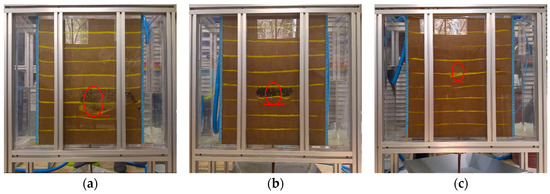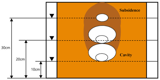 Cavity formation location with respect to various groundwater levels: (a) 10 cm, (b) 20 cm, and (c) 30 cm.