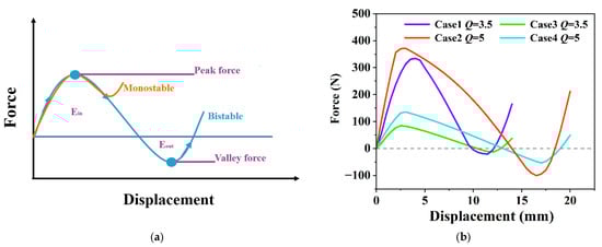 (a) Typical force–displacement relationship of mono-stable and bi-stable structures; (b) force–displacement curves of the four cases; (c) trapped energy; (d) specific trapped energy.