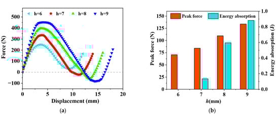 The peak load, representing the maximum load before structural snap-through, typically characterizes the structure’s ability to resist external loading, i.e., initial stiffness. As seen in Figure 10a, the peak load of the HMCSs increases with increases in parameters h and t. Within the selected parameter range, the maximum peak force is approximately 20.7 times greater than the minimum.
