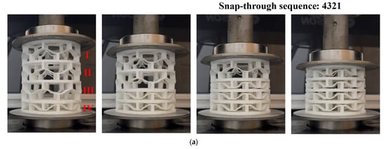 When the HMCS is loaded, the snap-through response sequence occurs as shown in Figure 11, where (a) corresponds to Case 1 and (b) corresponds to Case 2. The results show that when the HMCS begins to compress, the layer with the lowest thickness begins to deform first. Once this layer is fully deformed, the remaining layers are captured sequentially based on the increasing thickness of their respective beams. As shown in Figure 12, the four local maxima and minima in the force–displacement curve correspond to the four curved beams with different thicknesses within the multi-layer HMCS. The deformation process of each layer can be divided into three stages, consistent with the structural response described in Section 2. Initial deformation occurs during the first stage, where the structure primarily experiences combined compression and bending. The required force rapidly increases with increasing displacement. Hence, this stage is referred to as the positive stiffness stage. In the second stage, the structure mainly undergoes compression deformation, and the force–displacement curve exhibits elastic instability, revealing a negative stiffness effect. Thus, this stage is defined as the negative stiffness stage. The third stage marks the densification of the structure, during which the curved beams gradually become compacted. As displacement further increases, the required force rises again, and the structure once more exhibits positive stiffness behavior.