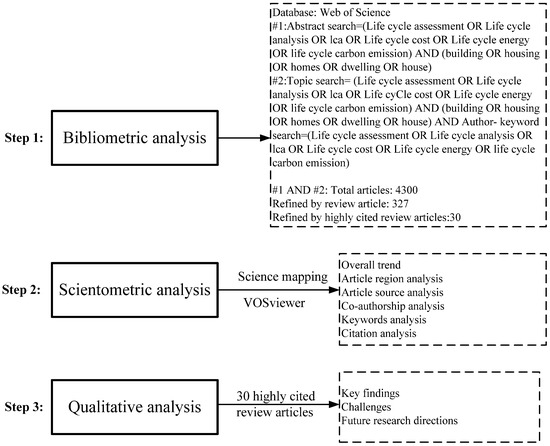 Based on various case studies, previous review articles of LCA-B have systematically summarized the methodologies, findings, and research directions mainly from a specific perspective (e.g., construction materials, building types, building components, uncertainty, integration of digital twins/artificial intelligence/BIM). However, few studies are observed on systematic and comprehensive investigating the current state of LCA-B that synthesize the existing review literature. Specifically, the findings and challenges summarized from the highly cited review papers are more convincing and enlightening. Therefore, the objective of this comprehensive systematic literature review is to identify the characteristic distribution of the existing review literature using bibliometric analysis and the key findings in the field of LCA-B. The organizational framework of this manuscript is systematically structured as follows—Section 2 elucidates the comprehensive research methodology employed in conducting the systematic literature review, which comprises three sequential phases: (i) systematic data acquisition, (ii) bibliometric performance assessment, and (iii) integrated quantitative–qualitative analytical framework. Section 3 provides a comprehensive overview of 327 review articles based on both quantitative and qualitative analytical methodologies, and then synthesizes the empirical findings derived from 30 highly cited review articles. Section 4 presents the conclusions and prospective directions for future investigation.