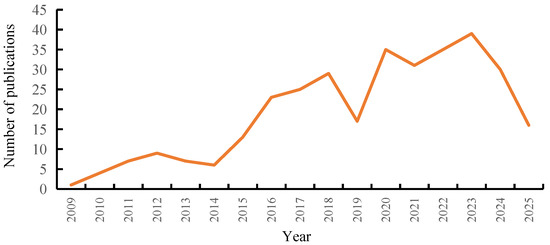 Distribution of the 327 review studies from 2009 to 2025.