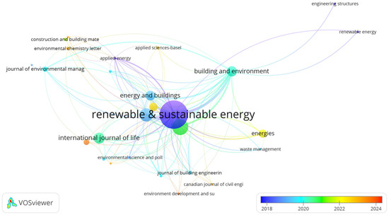 Exploring the journal sources published in the LCA_B field reflects the most popular and suitable journal for publication, as displayed in Figure 4. In VOSviewer, the minimum number of papers was set to 2 and the minimum citation number was set to 10, 27 sources were finally obtained from the 72 sources identified. As a larger size of the nodes and fonts indicated a larger number of articles published in that journal, the most popular journal was observed to be Renewable & Sustainable Energy Reviews with the highest publication number of 78 articles and the highest citation number of 10,162, followed by Sustainability (publication number: 35, citation number: 1316), Journal of Cleaner Production (publication number: 27, citation number: 2417), and International Journal of Life Cycle Assessment (publication number: 20, citation number: 1125). In addition, a thick line between two nodes indicates a high frequency of citations between the two journals, and a long distance between the nodes indicates a weak link strength between the two journals. The publication period can be distinguished from the colors, and the recently published articles are shown in brighter colors. From the total link strength scores, as shown in Table 2, Renewable & Sustainable Energy Reviews (the total link strength scores of 328) and Building and Environment (the total link strength scores of 192) are the two most active journals in the research. Although the article number from Environmental Chemistry Letters, Applied Energy, and Environmental Research Letters is less than 5, their impact on LCA-B research is the highest as reflected by the high number of citations.