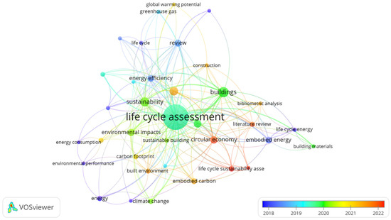 Keywords reflect the core topics of a review article and can be analyzed using “Author keyword” in VOSViewer as shown in Figure 7 and Table 5. The minimum number of occurrences was set to 5, and keywords having the same semantic meanings (such as “life cycle assessment”versus “life cycle analysis” versus “lca”, “building information modeling” versus “building information modelling” versus “bim”, “buildings” versus “building”) were integrated. Finally, 36 keywords were identified to meet the thresholds from 1055 keywords. In Figure 7, as the size of the nodes and fonts represents the occurrences of the keywords, “life cycle assessment” (occurrences: 237) is observed to be the most frequently used keyword, followed by “buildings” (occurrences: 38), “sustainability” (occurrences: 31) and “building information modeling” (occurrences: 27). In addition, the distance and thickness of the connection line represents the strength of the relationship between the two keywords. The occurrence period of the keywords can be distinguished from the colors, and “energy”, “concrete”, “life cycle energy”, and “environmental performance” are the earlier frequently used keywords while “social life cycle assessment”, “life cycle sustainability assessment”, “scientometric analysis”, “literature review”, “bibliometric analysis”, “circular economy”, and “building information modeling” are hot topics in recent review articles. Although the occurrences of four keywords, i.e., “climate change”, “carbon emissions”, “construction industry”, and “building materials”, are all no more than 10, they are actually influential keywords in recent studies from the high scores of the average normal citation.