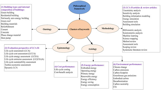 As indicated by Li et al. [76], all the keywords of a topic can be involved in four philosophical aspects, i.e., ontology, epistemology, methodology, and axiology, implicitly or explicitly. In this study, the keywords are divided into six clusters based on the above philosophical framework, indicating the main topics of LCA-B review articles, as shown in Figure 8.