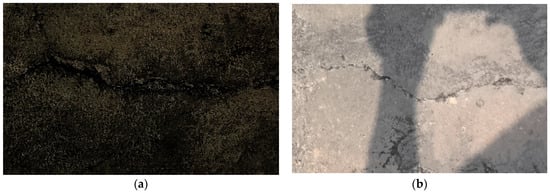 Images of a hydraulic concrete surface with poor luminance: (a) low light; (b) non-uniform luminance.