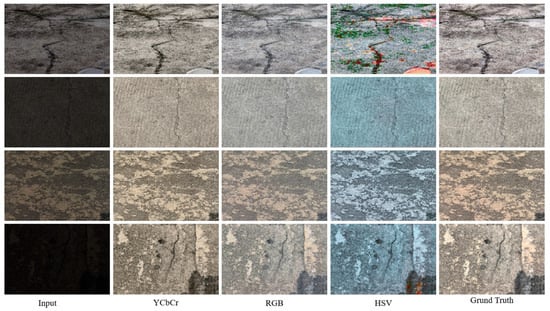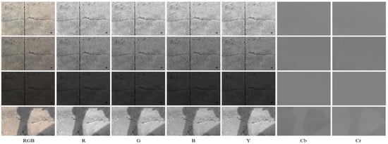 As shown in Figure 2, we conducted a comparative analysis of hydraulic concrete images with varying luminance levels in both the RGB and YCbCr color spaces. The results indicate that hydraulic concrete images exhibit similar content characteristics across each channel in the RGB space, primarily due to the limited color richness of these images. In the YCbCr color space, the Y channel effectively reflects the overall luminance of the image, while the Cb and Cr channels preserve image detail information well, particularly in terms of defect details.