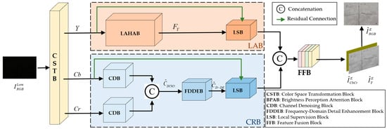 The output feature maps from the LAB and CRB are then fed into the FFB, which combines the luminance-adjusted and chrominance-restored features to produce the final enhanced hydraulic concrete image.