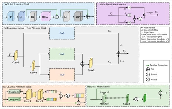 The framework of the LAHAB. (a) Luminance-Aware Hybrid Attention Block. (b) Global Attention Block. (c) Multi-head self-attention. (d) Channel Attention Block. (e) Spatial Attention Block.