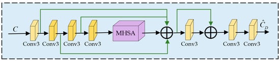 Inspired by the work in [] and as illustrated in Figure 5, we design the CDB with MHSA as its core component, integrating convolutional and attention mechanisms to independently denoise the Cb and Cr channels. Specifically, each chroma channel is passed through the CDB, where it undergoes four convolutional layers, the first with a stride of 1 to preserve local information and the remaining three with strides of 2 to progressively down-sample and extract features at multiple spatial scales. This design enables the network to capture both fine and coarse chrominance representations. The multi-scale features are then processed through MHSA to model global dependencies. A residual connection is applied to maintain feature integrity, followed by an up-sampling operation to recover the original resolution, thus completing the channel-wise denoising process.