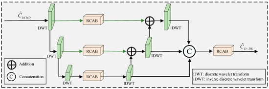 As illustrated in Figure 6, within the FDDEB, denoised–merged chroma channel information  undergoes a three-level discrete wavelet transform (DWT) for progressive down-sampling, followed by a symmetrical three-level inverse discrete wavelet transform (IDWT) during up-sampling. This wavelet-based decomposition captures both low-frequency chrominance context and high-frequency detail features, enabling the model to retain multi-scale texture cues such as crack edges, rough surfaces, and defect contours that are often lost in conventional down-sampling operations.