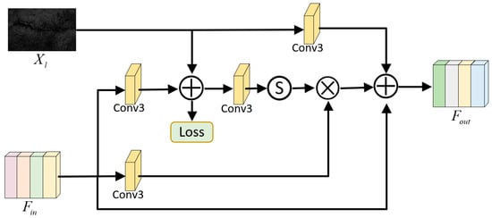 To complement the global perception with finer detail understanding, we further design a Channel Attention Block (CAB) and a Spatial Attention Block (SAB), following the principles proposed in [,], respectively. These two modules focus on local luminance features, such as crack boundaries, shadows, and texture variations, which are critical for highlighting defect regions. The CAB and SAB are connected in parallel, allowing the model to simultaneously attend to inter-channel relevance and spatial saliency. Convolutional layers with a kernel size of 3 are applied both before and after the attention modules to refine feature representation and ensure local consistency.