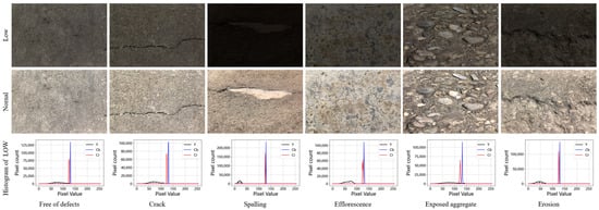 To ensure the reliability and diversity of the dataset, all image pairs were manually reviewed and aligned. Figure 8 presents representative samples from the LLHCID, showcasing a variety of paired low-light and bright-light hydraulic concrete images captured under different illumination conditions. The samples include diverse surface states, such as those free of defects and those with cracks, spalling, efflorescence, exposed aggregate, and erosion.